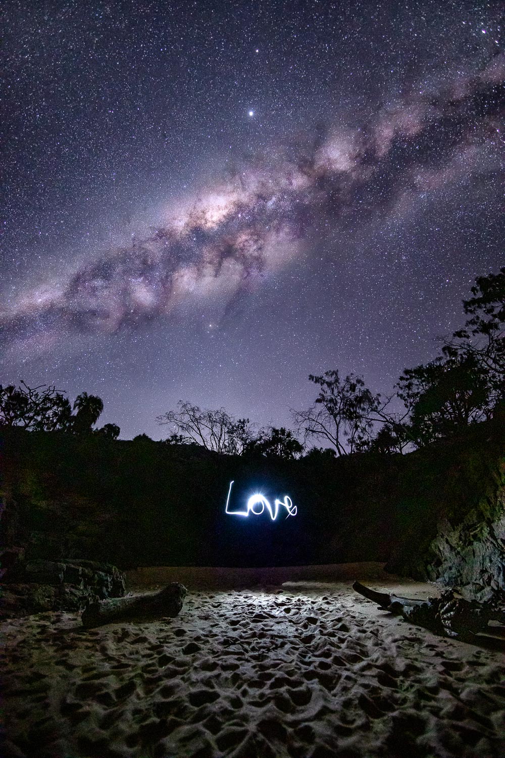 The Milky Way was overhead this cool night in August 2020, and my attempts to have a composition with the ocean were squandered. So I decided to have a little fun. I was in a pretty private location at Chinamans Beach, Agnes Water. To capture the Milky Way I had to face the opposite direction to where I wanted to be.  Because the foreground wasn’t as appealing, I decided to use my headlamp to light paint with. I set my camera on a 20 second exposure (close to what I would normally use when shooting astro) and ran in front of the lens, shuffled my feet so they didn’t stay in the one position, while writing ‘Love’ backwards, then ran back out of view. I attempted a few other words and symbols, however ‘Love’ was one of the only legible words that I was happy with.